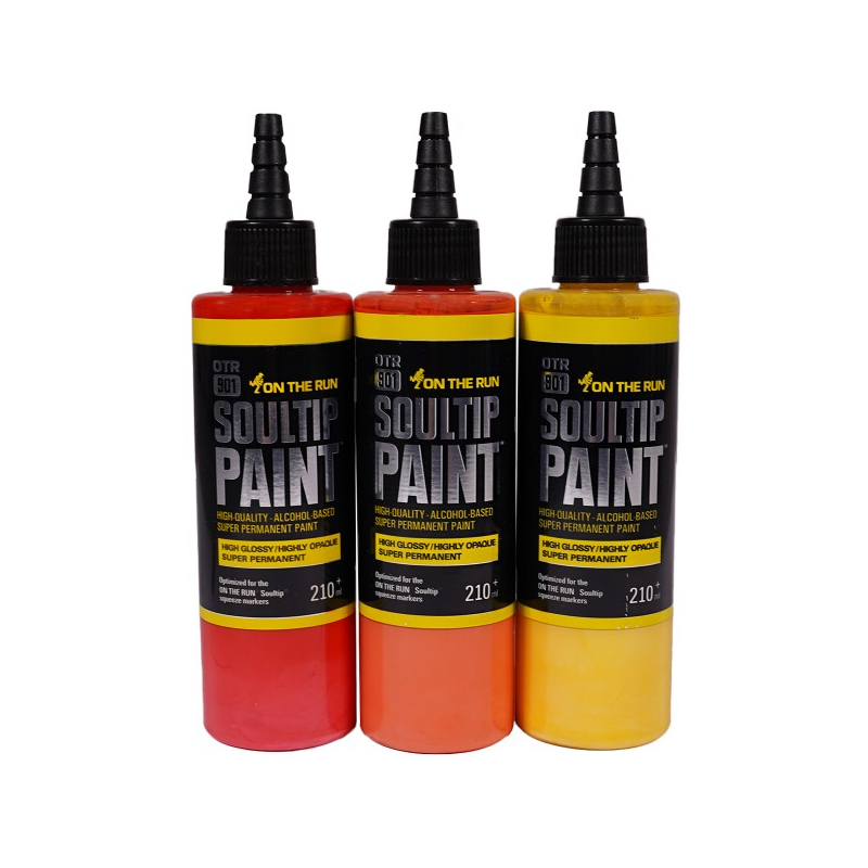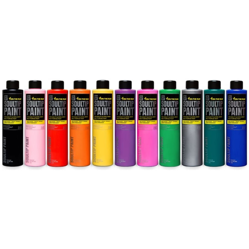 La recharge de 210ml On The Run 901 Soultip Paint est une peinture à base d'alcool utilisable pour remplir les marqueurs squeezer pinceaux et même les aérographes.